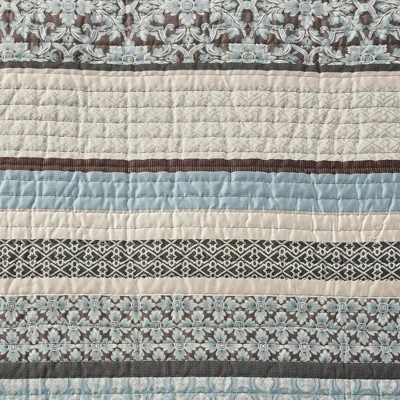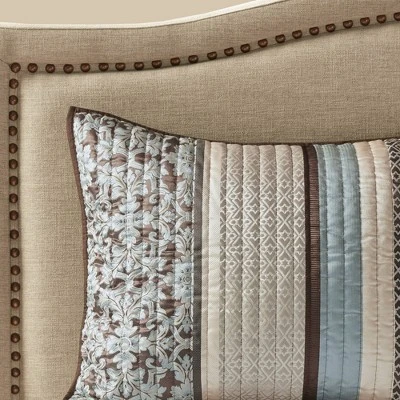 Update your bedroom with the sophisticated style of the Cambridge 5pc Reversible Jacquard Quilt Set. A creative color combination with a pieced jacquard design is beautifully displayed on the quilt and shams, for an elegant transitional appeal. One square decorative pillow and one oblong pillow feature embroidery and pleating details that pull the jacquard bedding set together. Soft to the touch with cotton-rich filling, this jacquard quilt set is machine washable for easy care.