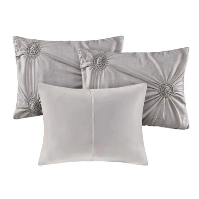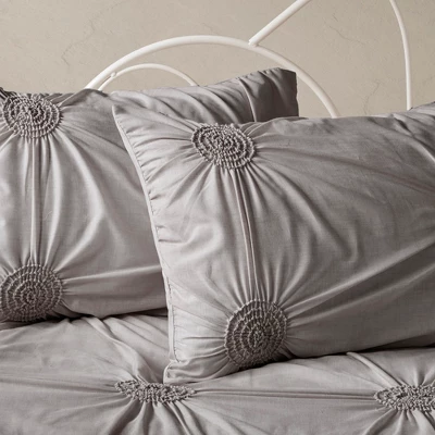 Grace your bedroom with the beauty and comfort of the Madison Park Leila 6 Piece Reversible Daybed Cover Set. The gorgeous dark grey daybed cover flaunts tufting and ruche detailing in a puckered diamond design with quilted on reverse, for a charming textural look. The 3 matching shams mirror the top of the daybed coordinating beautifully with the rest of the ensemble. An embroidered decorative pillow adds a stunning accent, while a solid bed skirt provides a clean finish to complete the bedding set. Displaying a yarn dye look, this tufted daybed cover set fits a Twin size mattress and brings s graceful elegance to your guest bedroom decor.