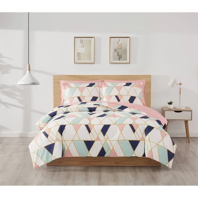 This modern geometric pattern with navy, teal, and pink shapes separated by gold lines is the statement print for this bed. The pillow shams use the geometric print for the face. To complete the bed, this ensemble comes with sheets and pillowcases in a coordinating wide stripe pattern with shades of pink. The entire set is machine washable, making this a convenient addition to your home. Includes one comforter (102×86 inches), two king shams (20×36 inches), one flat sheet (102×102 inches), one fitted sheet (78×80 inches) with a 12″ pocket to fit up to a 15″ mattress, and two king pillowcases (20×40 inches) Comforter is a printed 100% microfiber fabric with a 180 GSM fill. Sheet set and printed sham(s) are 100% microfiber. This item is machine washable, but please be sure to use appropriate sized machinery to avoid any excess wear on the items.