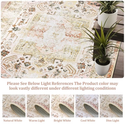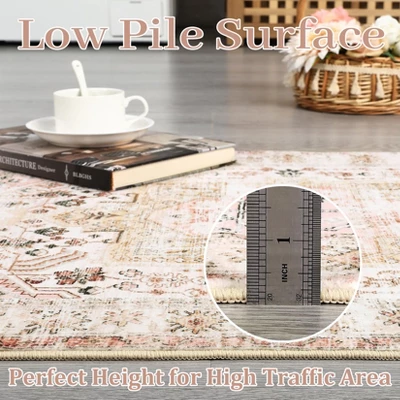 - [Timeless Distressed Design]This vintage -inspired rug showcases an artfully aged aesthetic, with muted tones and subtle wear patterns that evoke classic charm. The low-pile construction ensures easy furniture movement while maintaining a secure grip on hardwood, tile, or laminate floors. Its balanced weight prevents shifting without compromising the rug’s elegant drape.