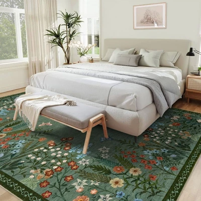 1.Botanical Floral Elegance Enhance your space with this stunning 8×10 rug featuring lush botanical floral patterns in vibrant green hues. The nature-inspired design brings organic charm to any room, perfectly complementing modern farmhouse, boho, or traditional decor styles. 2.Plush Faux Wool Comfort Experience luxurious softness underfoot with our premium faux wool construction. The 0.26″ thick pile offers cloud-like cushioning while maintaining a slim profile that easily fits under furniture – ideal for both comfort and practicality. 3.Effortless Machine Washable Care Designed for real-life messes, this rug is completely machine washable. Simply toss in cold water (gentle cycle) to refresh – the colorfast floral patterns stay vibrant wash after wash, maintaining their beauty through years of use. 4.Secure Non-Slip Performance The advanced TPE rubber backing provides superior grip on all floor types, preventing dangerous slips while protecting your floors. The rug stays firmly in place even in high-traffic areas like living rooms and hallways. 5.Durable Family-Friendly Design Crafted from high-density, non-shedding materials that resist pet hair and stains. The skin-friendly surface is gentle for children’s play while standing up to daily wear – perfect for busy households with kids and pets.