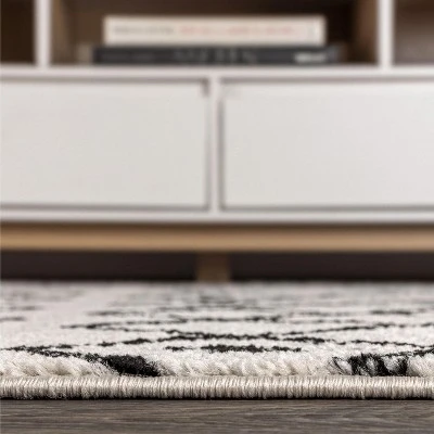 - The ivory and black color scheme reproduces the look of neutral, mid-century rugs