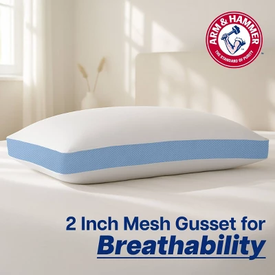Transform your sleep with the Arm & Hammer Cooling Comfort Sleep Pillow. Covered with a unique cool-to-the touch fabric blend of cooling fibers, this sleep pillow features a mesh side gusset to promote optimal airflow and temperature regulation, ensuring a refreshing sleep experience. The pillow is generously filled and designed to provide balanced support for your preferred front, side or back sleep positions. It also features proprietary protection that keeps the pillow fresher, longer. Elevate your rest at night with cooling comfort and freshness you can trust.