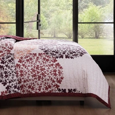 The Rosewood Harmony 3 Piece Reversible Coverlet Set has a pleasant grouping of leafy medallions in earthy shades of burgundies and blushes. The reverse has a tonal burgundy pattern, perfectly coordinating with the front and offering a second look for your bedroom. This 100% cotton sateen 3 piece set includes 2 printed shams, and a 100 gsm filled quilted coverlet. As a bonus, the set is packaged in a reusable self-fabric tote.