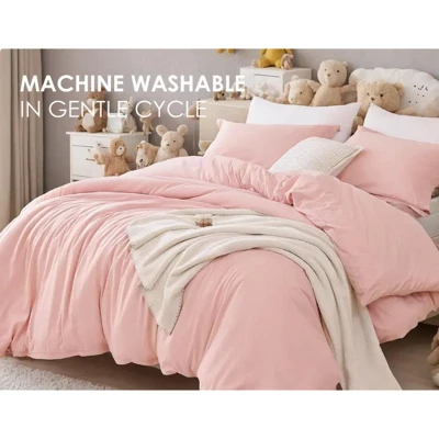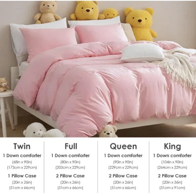 Indulge in luxury with our Three – piece Bedding Set from the Super Soft Microfiber Hotel Series. Crafted from brushed super soft microfiber, this set offers a cloud – like comfort that transforms your bedroom into a haven of relaxation. The set comes in an adorable pink color, adding a touch of charm and warmth to your sleeping space. It includes a quilt cover and two pillowcases, providing a coordinated and elegant look for your bed. And the best part? It’s machine washable, making maintenance a breeze.Twin1 Down comforter(68in x90in)(173cm x229cm)1 Pillow Case(20in x26in)(51cmx66cm)FUII1 Down comforter(80in x90in)(203cm x229cm)2 Pillow Case(20in x 26in)(51cmx66cm)Queen1 Down comforter(90in x90in)(229cmx229cm)2 Pillow Case(20in x 26in)(51cmx66cm)King1 Down comforter(104in x90in)(264cmx229cm)2 Pillow Case(20in x36in)(51cmx91cm)
