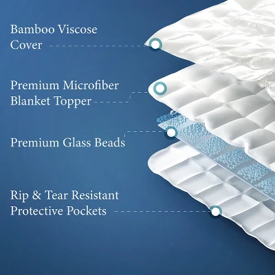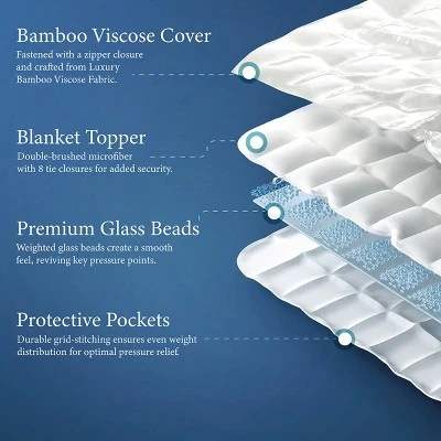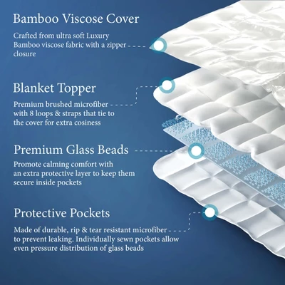 Reimagine your rest with the Cosy House Weighted Blanket—a luxurious blend of comfort and serenity designed to transform your relaxation routine. Paired with a zippered cover crafted from premium rayon derived from bamboo, this silky soft blanket offers cooling comfort, perfect for year-round use. The secret to its calming touch lies in the thousands of tiny glass beads, meticulously stitched into a square-quilted design. This innovative design distributes deep-touch pressure evenly across your body, mimicking the soothing embrace of a hug. This gentle pressure melts away stress and tension, helping you unwind and promoting deeper, more restful sleep.Ideal for those with sensitivities, the cover naturally resists common household non-living allergens, creating a cleaner, healthier sleep environment. Experience a comfortable, secure fit with the Weighted Blanket’s durable 8 fastening loops and reinforced zipper, designed to prevent shifting and bunching for uninterrupted rest. Plus, the easy-care removable cover is resistant to stains, wrinkles, and pilling. Enjoy a blanket that stays fresh, smooth, and ready to provide lasting comfort night after night, wash after wash!Whether you’re easing into relaxation after a hectic day or settling in for a restorative sleep, the Cosy House Weighted Blanket offers the perfect balance of coziness, tranquility, and timeless style.
