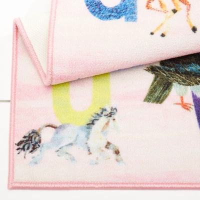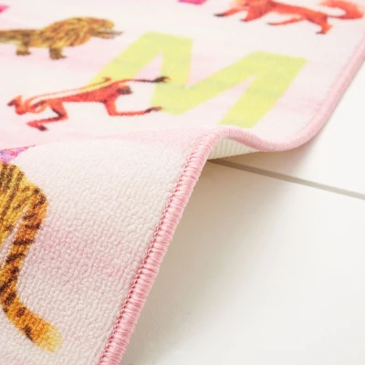 - The Eric Carle Elementary Pink Alphabet rug by Home Dynamix features the letters of the alphabet and friendly animals, making it a perfect addition to any playroom or classroom. It’s machine washable and a non-skid latex backing helps to keep it in place.