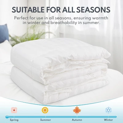 - All-Season Use: Lightweight yet warm, this comforter is perfect for year-round use. The breathable down filling regulates temperature, making it suitable for any weather, ensuring your comfort throughout all seasons. This goose feather comforter is perfect as a summer down comforter king size or a winter duvet king size