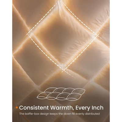 Discover the ultimate comfort with the SONGMICS HOME down comforter! This king-size down duvet is as light and warm as a gentle caress, making it perfect for all-season use. Whether it’s a chilly winter night or a warm summer evening, this feather comforter ensures a cozy environment in any bedroom, guest room, or hotel. Say goodbye to seasonal bedding swaps and hello to uninterrupted comfort!Perfect Blend of Down and FeatherWrapped in a soft microfiber cover, this feather comforter is filled with fresh duck down and feathers, ensuring safe and luxurious usage. The baffle-box design ensures an even distribution of warmth, enveloping you in a cocoon of comfort. Plus, the sturdy microfiber cover prevents feather leakage and reduces noise with each movement, making it your passport to a peaceful and uninterrupted night’s sleep.Specifications:Color: Cloud WhiteMaterial: Microfiber Fabric Cover, Duck Down Filling, Duck Feather FillingProduct Size: 106″L x 90″W (270 x 229 cm)Product Weight: 7.9 lb (3.6 kg)Package Contents:1 x Down ComforterSONGMICS HOME Notes:Flat measured, size discrepancy of ±0.8″-1.2″ is normal.When you first remove the duvet from its vacuum-sealed packaging, it may take up to 48 hours for it to fully fluff up. A quick tip to expedite this process is to use a tumble dryer on a low heat setting.Our duvet is generously filled with natural duck down and feathers. Upon initial use, you may notice a distinctive, natural scent—rest assured, this is completely normal.For those chillier months, we suggest draping a blanket over the duvet. This not only boosts the warmth but also adds a sense of lavish thickness.