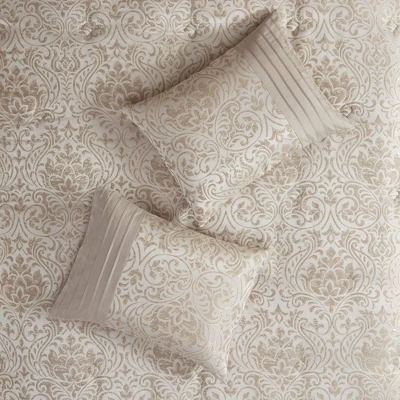 The Madison Park Grace 12 Piece Jacquard Comforter Set will add elegance to your bedroom. The comforter and shams have a damask pattern in gold metallic thread that shines on the jacquard fabric, creating a refined look. The comforter is paired with two Euro shams and a bedskirt in a solid dark khaki that matches well. Also provided is a microfiber sheet set in a soft egg-shell white and 2 decorative pillows to complete the look.