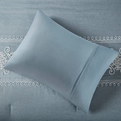 Bring a dreamy and romantic allure to your bedroom with the Intelligent Design Laurel Embroidered Comforter Set. This lovely comforter features beautiful embroidery details at the foot of the bed that add an elegant touch of beauty. Matching shams complement the comforter and complete the casual look of the comforter set. The hypoallergenic polyester filling in the contemporary comforter contains no allergens and is treated to be dustproof. Machine washable for easy care, this comforter set has an antimicrobial treatment that helps reduce the growth of odor causing bacteria and keeps fabric lasting longer. Items may come in rolled or compressed packing and will need to be fluffed up. Use a steam iron to help remove wrinkles easier.