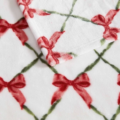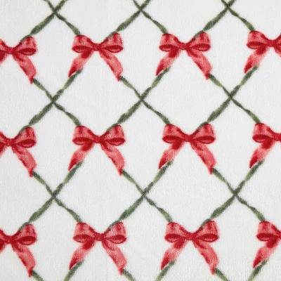 - The Martha Stewart Emma Bow Printed Plush Throw In A Green And Red Printed On A White Ground