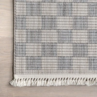 Indulge in timeless elegance with the geometric pattern of this rug, a hallmark of refined taste in any room. Delicately woven squares create a visually captivating design that effortlessly complements diverse decor styles. The pastel palette instills serenity, ideal for crafting a calm and inviting ambiance. What truly distinguishes this rug is its subtle luster, as carefully selected fibers offer a gentle sheen, adding an understated touch of sophistication. This slight shimmer enriches the rug’s luxurious appearance, catching the eye and elevating the entire room. Tasseled ends further enhance its allure, infusing an extra layer of elegance and playfulness into the design.