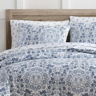 Stone Cottage Caldecott duvet set features stylized leaves and vines surrounded by decorative medallions, creating a graphic damask in varying tones of light blue on a white cotton ground. Panel cut standard shams with centered medallions add a custom look to complete this simple, yet elegant ensemble. Duvet set is 100% Sateen Cotton with a T230 thread count. Machine washable for easy care.