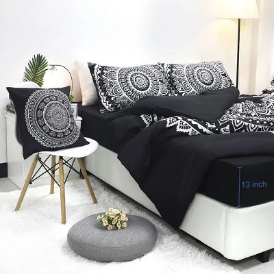 What is Bohemian Style?Bohemian style refers to a style of clothing that retains the characteristics of a certain nomadic people, which is characterized by bright handmade decorations and rough and heavy fabrics.Bohemian style represents an unprecedented romanticization, folklore, and liberalization. It also represents an artist temperament, a fashion trend, and an anti-traditional lifestyle. Features: 1.Unlike cheap polyester fabrics, we choose Polyester Microfiber , which is softer and not fade, and has a longer service life. 2.Address all your bedding needs——4/5 Piece bedding set include 1 duvet cover+1 fitted sheet+1/2 pillowcase+1 throw pillowcase. 3.Quilt Set are designed with zipper closure and concealed rope to keep the duvet fixed in place. 4.Color: Black, Purple, Navy Blue, White and Black, Red, Light Blue, White and GreenAbout Size(No Comforter & Pillow Insert Included) 1. TWIN SIZE–Duvet cover:90″x68″, Fitted Sheet:74″x38″(13″deep), Pillowcase: 20″x27″(1pc), Throw Pillow Case:18″x18″ 2. QUEEN SIZE–Duvet cover:90″x90″, Fitted Sheet:79″x60″(13″deep),Pillowcase:20″x 27″(2pc), Throw Pillow Case:18″x18″ 3. KING SIZE–Duvet cover:102″x90″,Fitted Sheet:79″x 77″(13″deep),Pillowcase:20″x 35″(2pc), Throw Pillow Case:18″x18″Nice tips: 1. To protect the sheet, please turn the inside out when you wash the bedding set. 2. Soaking time should not to be too long and tumble dry on low.