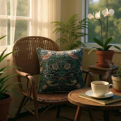 A sumptuous design that is instantly recognizable as the work of William Morris designs; it reproduces an original tapestry piece of his created in the 19th century called Strawberry Thief also known as William Morris birds. It depicts a story of why the juicy ripen strawberries are always disappearing in the garden? The witty eyes of birds tell all.