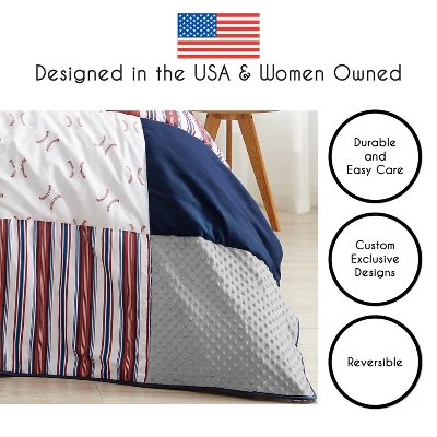 - This set boasts an impressive array of exclusive fabrics combining a fun baseball print and a coordinating stripe.
