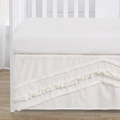 Boho Fringe Collection dust ruffle crib skirt will add a finishing touch to your nursery. Decorate any room with this stylish mix and match piece or coordinate with an existing Sweet Jojo Designs ensemble to get a complete bedding set look. Sweet Jojo Designs creates various coordinating room accessories and decor for all of their children’s bedding and nursery set collections (These items not included). 100% Cotton – Solid Ivory Finished with a Tufted Trim