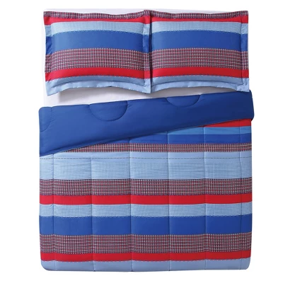 Easy to coordinate blue and red plaid and solid stripe patterns with printed texture complete this comforter set that includes a standard pillow sham(s). The reverse is a printed denim in blue. 100% microfiber polyester face and back. 100% Polyester filling. Machine washable. Includes: 1 twin comforter 68×86 inches and 1 standard sham 20×26 inches.